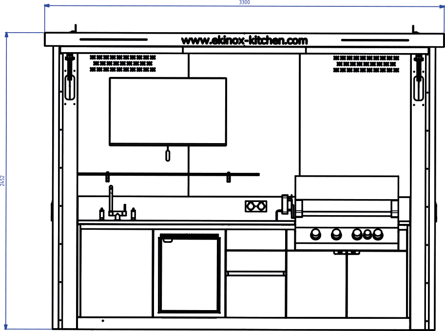 La cuisine EKLYPS est conçue autour d’une implantation complète et fonctionnelle : un module rangement sous évier (60 cm) pour la praticité. un réfrigérateur sous plan (60 cm) pour garder boissons et ingrédients à portée de main. un module trois tiroirs (50 cm) pour vos ustensiles et accessoires. un large module cuisson (100 cm), personnalisable en version barbecue ou plancha. Cette configuration équilibrée réunit tout le nécessaire pour cuisiner et recevoir en extérieur dans un espace fluide et ergonomique.